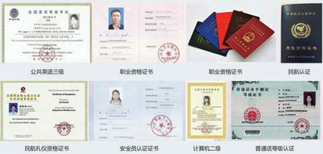 公共英語三級(jí)證書、民航崗位資格證書、民航禮儀資格證、安全員認(rèn)證證書、計(jì)算機(jī)二級(jí)、普通話等級(jí)認(rèn)證、國際航協(xié)航航空公司乘務(wù)課程合格證等。