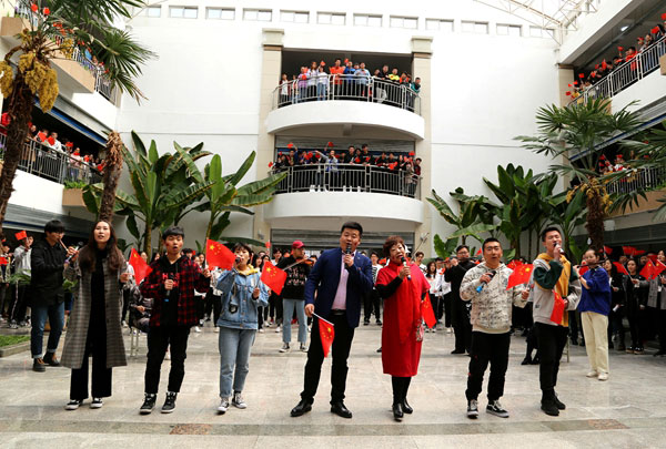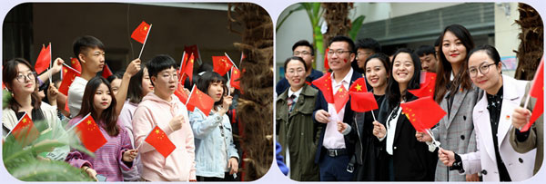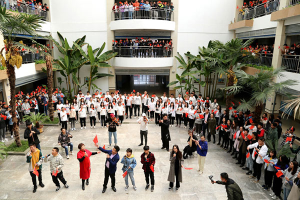快閃活動(dòng)持續(xù)推向高潮,更多的同學(xué)被吸引進(jìn)來(lái),舞蹈與唱歌的同學(xué)不時(shí)變換位置,形成新的隊(duì)形,擺出新的姿勢(shì),整個(gè)活動(dòng)愈發(fā)精彩。在一旁圍觀的同學(xué)們也揚(yáng)起了小紅旗,隨著歌聲與舞姿一起揮動(dòng)。