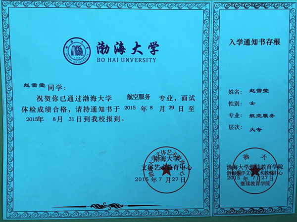 恭喜趙雪瑩同學(xué)被我校錄取【渤海大學(xué)航空】