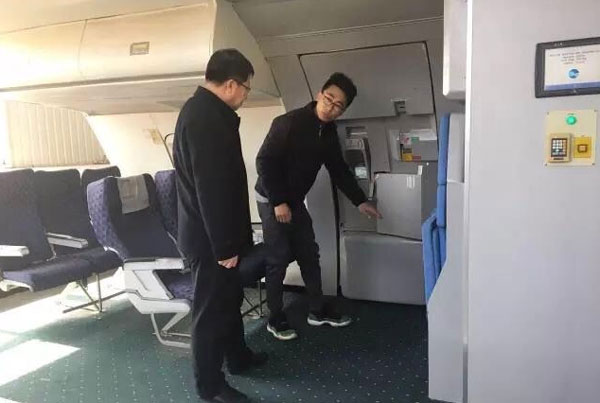 工程師齊新松詳細講解航空模擬艙設(shè)備的訓練方式和方法,并操作演示,冷志強院長認真聆聽并反復咨詢操作時的注意事項。