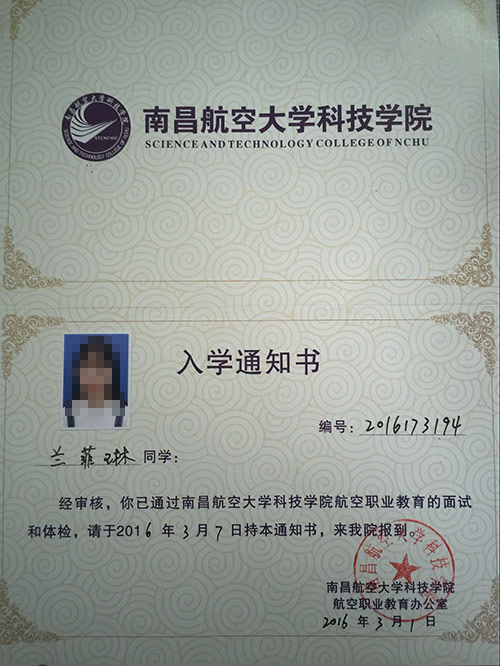 恭喜蘭菲琳同學(xué)被我校錄取【南航航空】