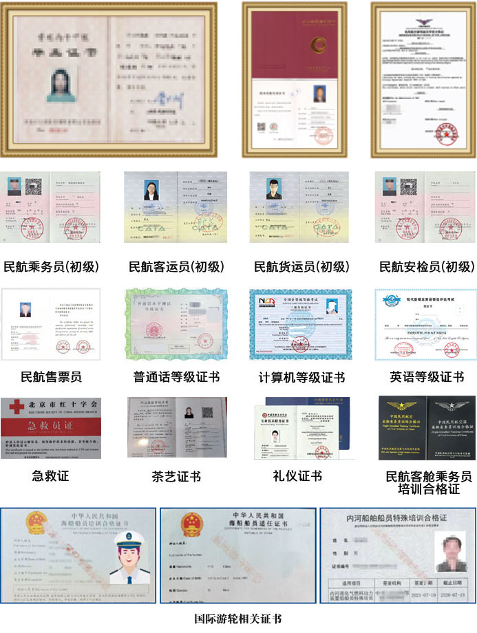 可根據(jù)所學(xué)專業(yè),參加相關(guān)部門或行業(yè)組織的考試,成績合格,可取得相應(yīng)的職業(yè)資格證書,如公共英語三級、普通話等級證書、安檢證書、民航客運證、急救證、海員證書、禮儀證書、茶藝證書、民航客艙乘務(wù)員培訓(xùn)合格證等。