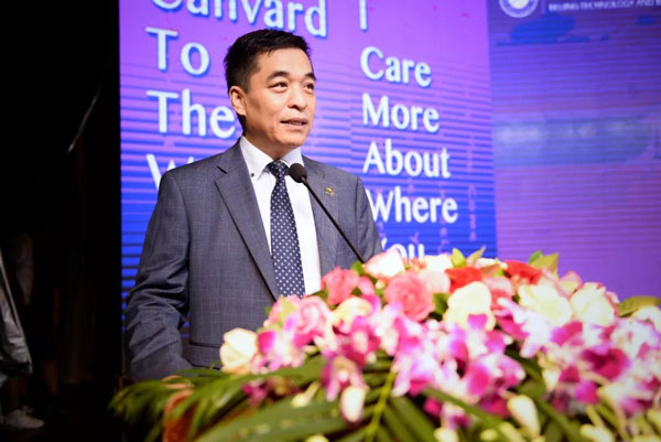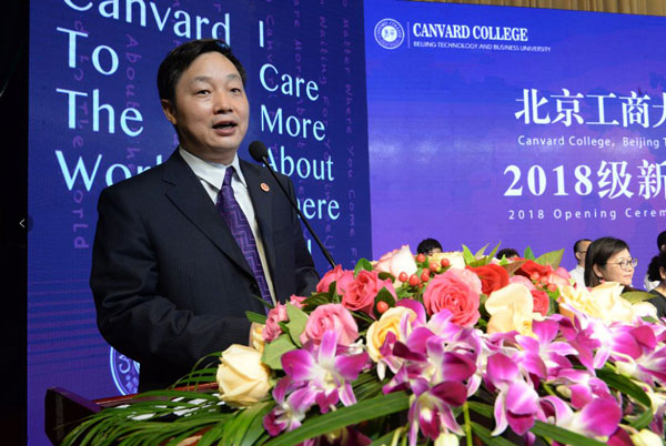 “我由衷感受到‘得天下英才而育之’的快樂。在此,我謹(jǐn)代表北京工商大學(xué)嘉華學(xué)院全體師生員工、全球嘉華校友,對你們的到來表示最熱烈的歡迎!同學(xué)們,當(dāng)你們邁進(jìn)嘉華學(xué)院校門那一刻起,你們的青春和夢想,你們的汗水和淚水,都將刻上嘉華學(xué)院的印跡。你們將在這里書寫你們新的人生篇章。相信你們的加入,學(xué)校因你們而更加精彩,你們也將會在嘉華觸及世界,成為最好的自己。國際嘉華已與你牽手,新的人生征程即將起航。青春無畏,也應(yīng)無怨無悔;學(xué)習(xí)很累,但奮斗的青春最美。”校長宋國華教授在講話中向新生提出了三點(diǎn)希望,他希望同學(xué)們主動(dòng)學(xué)習(xí)、獨(dú)立思考,增長本領(lǐng),修身養(yǎng)德,確定目標(biāo),全力以赴。