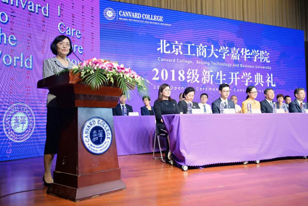 “嘉華學(xué)院從建立初期秉承北京工商大學(xué)優(yōu)良辦學(xué)傳統(tǒng)到如今不斷提高專業(yè)建設(shè)水平和教學(xué)質(zhì)量,改革創(chuàng)新人才培養(yǎng)模式,深入探索國際化辦學(xué)途徑,構(gòu)建全球多元化發(fā)展的教育教學(xué)平臺。實(shí)現(xiàn)了國際化進(jìn)程大跨步邁進(jìn)。通過近15年的努力,培養(yǎng)出了一批又一批富有創(chuàng)新精神和創(chuàng)業(yè)能力,具有全球化視野和國際競爭力的高素質(zhì)人才,為北京乃至全國的發(fā)展做出了應(yīng)有的貢獻(xiàn)。社會美譽(yù)度與日俱增,獲得了社會各界的廣泛好評。北京工商大學(xué)也會繼續(xù)支持嘉華學(xué)院的發(fā)展與建設(shè),幫助嘉華學(xué)院建設(shè)成為一流精英商學(xué)院?!北本┕ど檀髮W(xué)副校長方德英代表北京工商大學(xué)向2018級新生開學(xué)表示祝賀,并希望他們借助嘉華學(xué)院國際化、個(gè)性化的高端育人平臺,用國際范兒接受挑戰(zhàn),融全球化贏在未來。