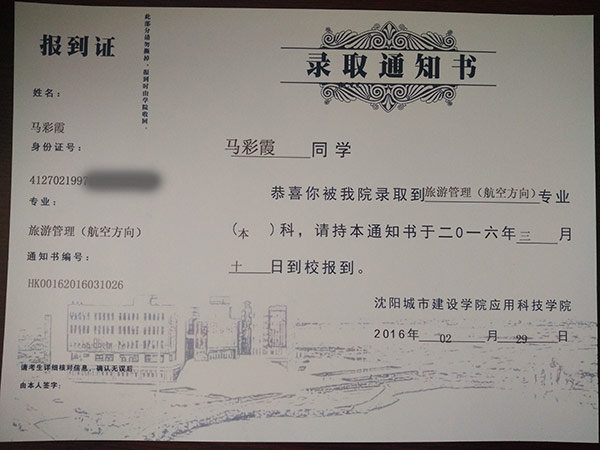 恭喜馬彩霞同學(xué)被我校錄取【沈城建航空】