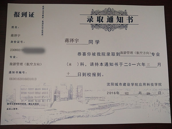 恭喜蔣澤宇同學(xué)被我校錄取【沈城建航空】