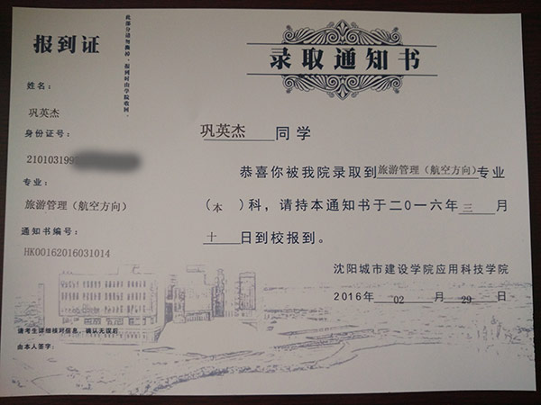 恭喜鞏英杰同學(xué)被我校錄取【沈城建航空】