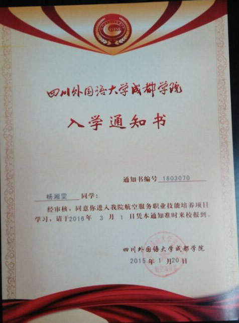 恭喜楊湘雯同學(xué)被我校錄取【川外成都航空】