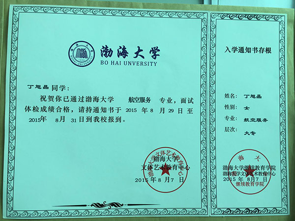 恭喜丁旭晶同學被我校錄取【渤海大學航空】