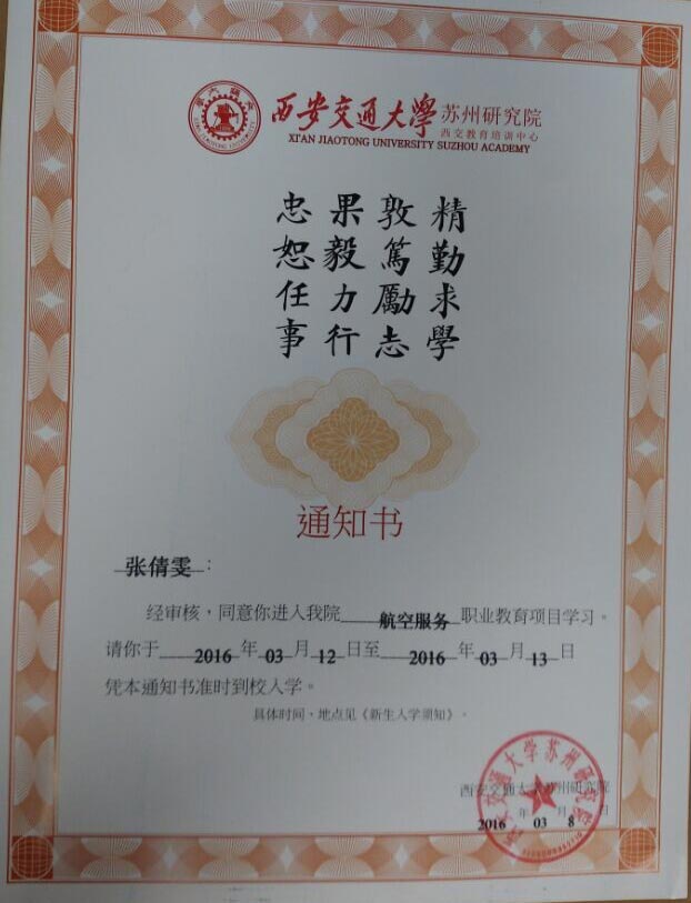 恭喜張倩雯同學被我校錄取【西交大蘇州航空】