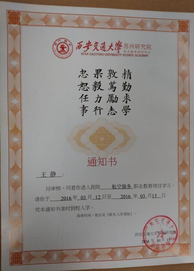恭喜王靜同學(xué)被我校錄取【西交大蘇州航空】