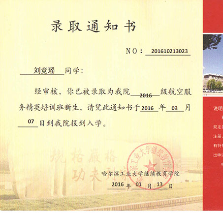 恭喜劉競瑤同學(xué)被我校錄取【哈工大航空】